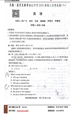 立即下载:湖南省雅礼中学2020届高三月考试卷(八)英语试题