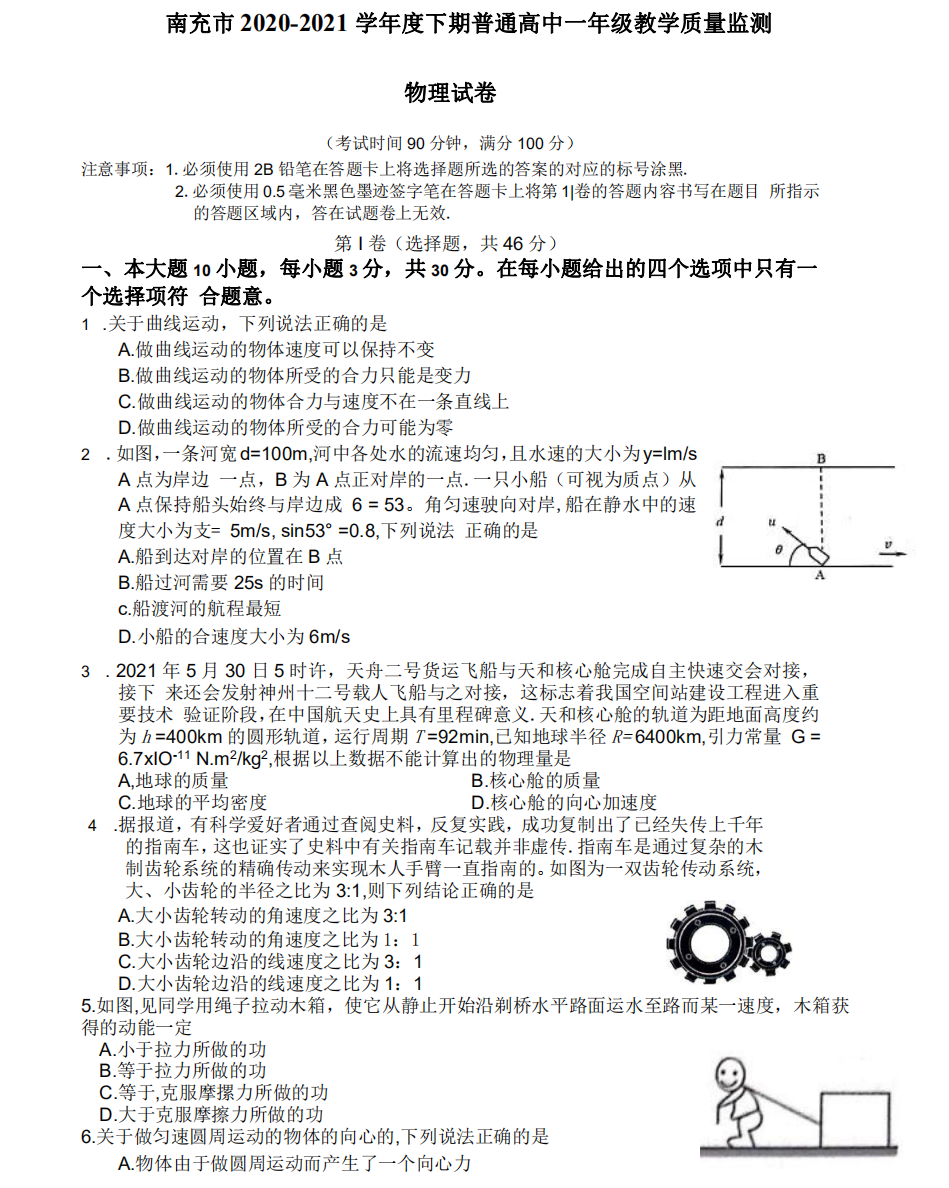 立即下载:四川省南充市2020-2021学年下学期高一教学质量检测物理试题