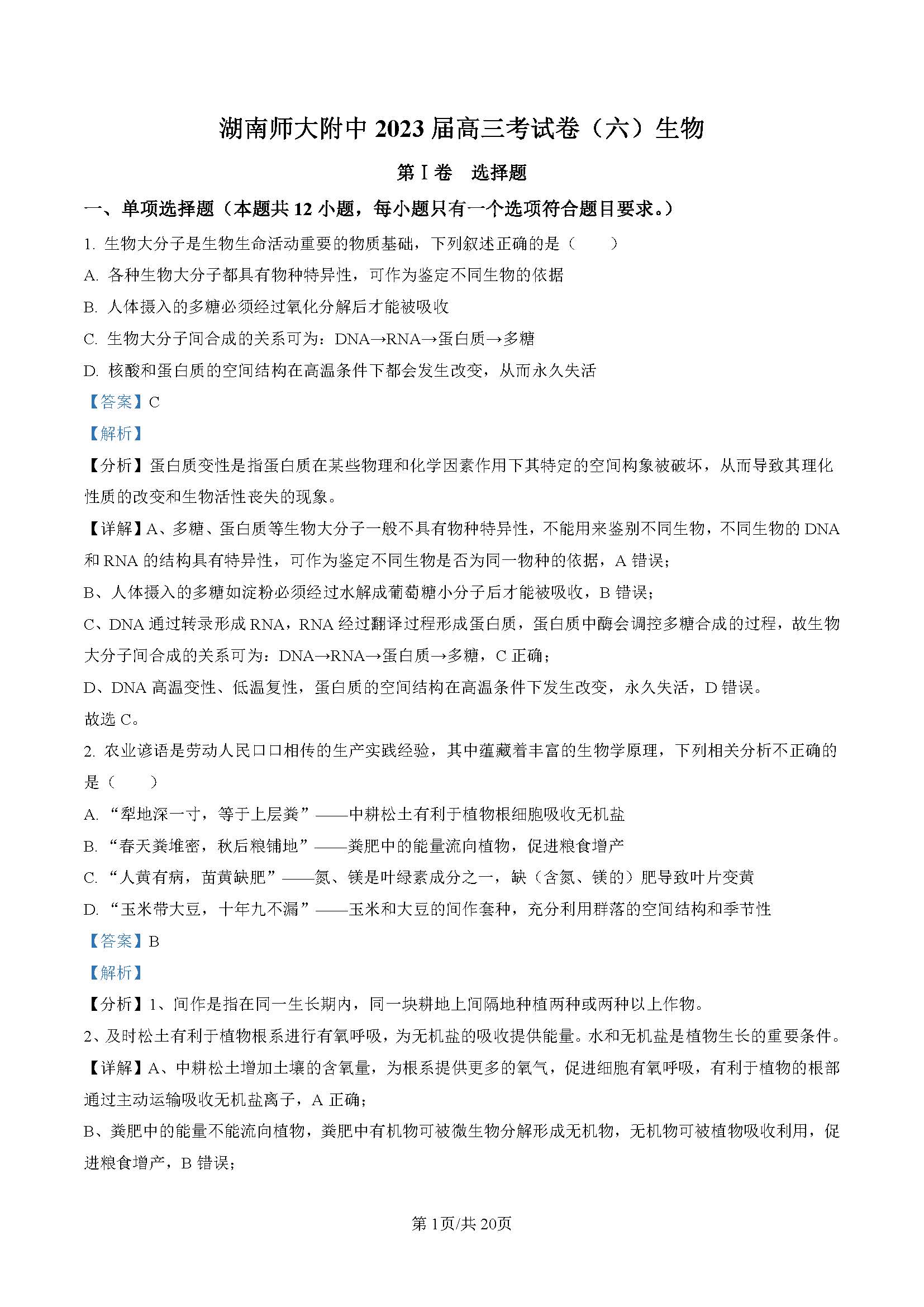 湖南师大附中2023届高三月考试卷六试题及答案汇总2023-02-06