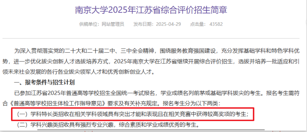 部分高校把竞赛奖项作为报考条件选项之一,如南京大学学科特长类招收在相关学科领域具有突出才能和表现且在相关竞赛中获得较高奖项的考生;