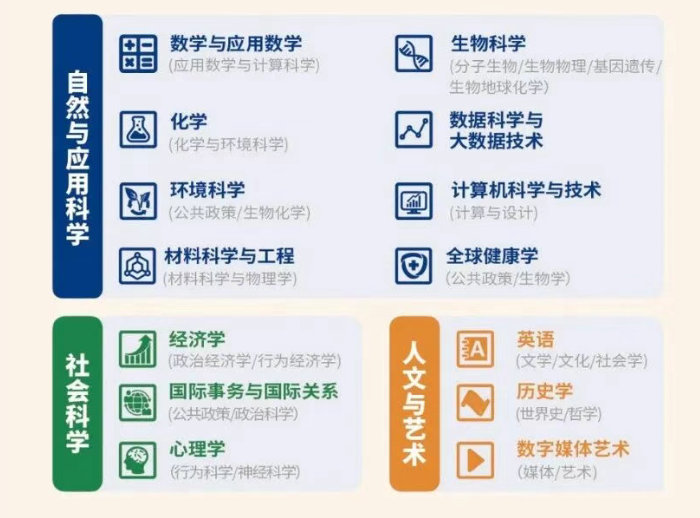 专业设置基于美国杜克大学实力最突出的学术领域,最鲜明的特色是紧跟时代的跨学科交叉属性。跨学科教育是全球高等教育发展最重要的趋势之一,而美国杜克大学在跨学科教育和科研方面是世界的领导者之一 (2025年泰晤士高等教育全球大学跨学科科学排名第四位)。我校每个大类专业均下设若干学术方向,总计近40个,为学生提供充分的个性化选择空间。详细专业介绍可查阅学校官网。