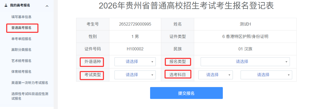 报考普通高考的考生,进入【我的高考报名】->【普通高考报名】菜单,填报外语语种、选考科目等相关信息并网上缴费。
