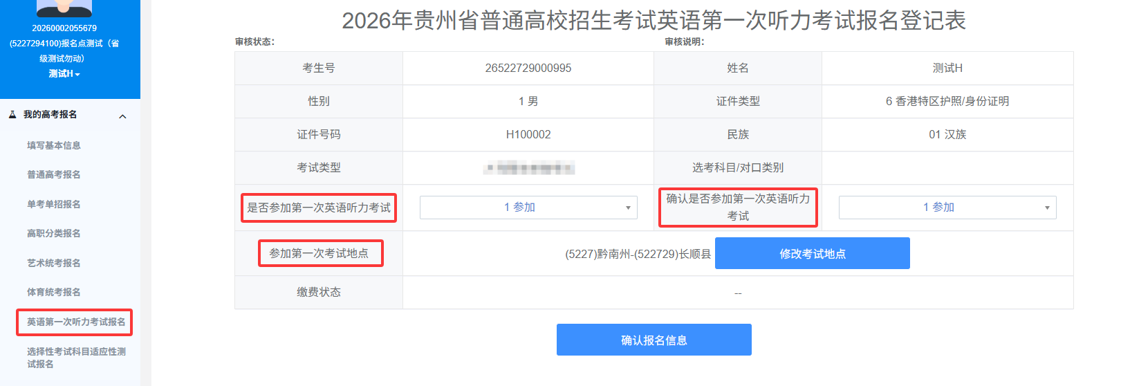 报考英语口语考试的考生,进入【我的高考报名】->【英语第一次听力考试报名】菜单,填报相关信息并线下缴费。