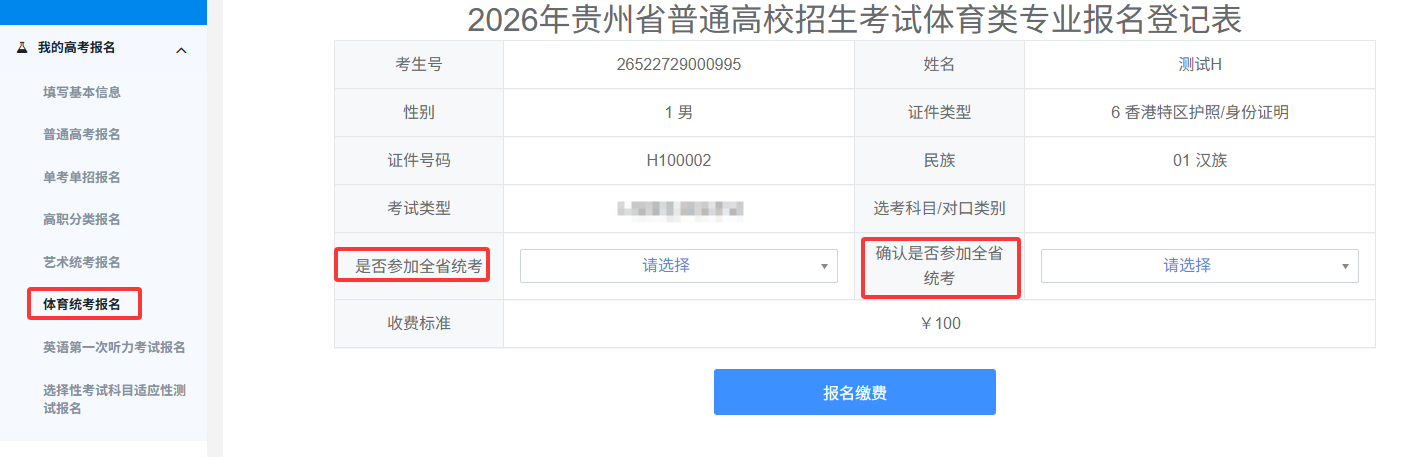报考体育类专业考试的考生,进入【我的高考报名】->【体育统考报名】菜单,填报相关信息并网上缴费。