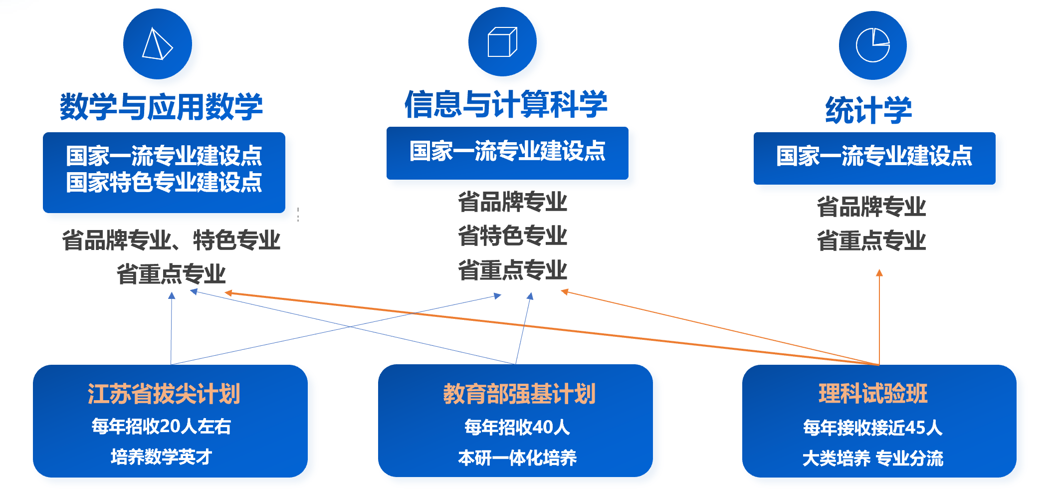 现有数学与应用数学、信息与计算科学和统计学三个本科专业。按照理科试验班、教育部强基计划、江苏省数学拔尖学生培养基地三个类别招生。人才培养聚焦数学、系统科学、统计学以及相关交叉学科专业方向,联合计算机、人工智能、网络空间安全、电子信息、电气交通等强势学科,基础应用并重,构建数学为基、以理启工、本研一体的培养体系,打造课程和教材核心资源,以本科生导师制做保障,以研学实践做支撑,以国际化做助推,促进人性化、个性化、本研一体化的人才培养,致力发挥每一位学生的创新潜能和活力,为国家和社会造就一批专业方向以及交叉学科方向的领军人才。