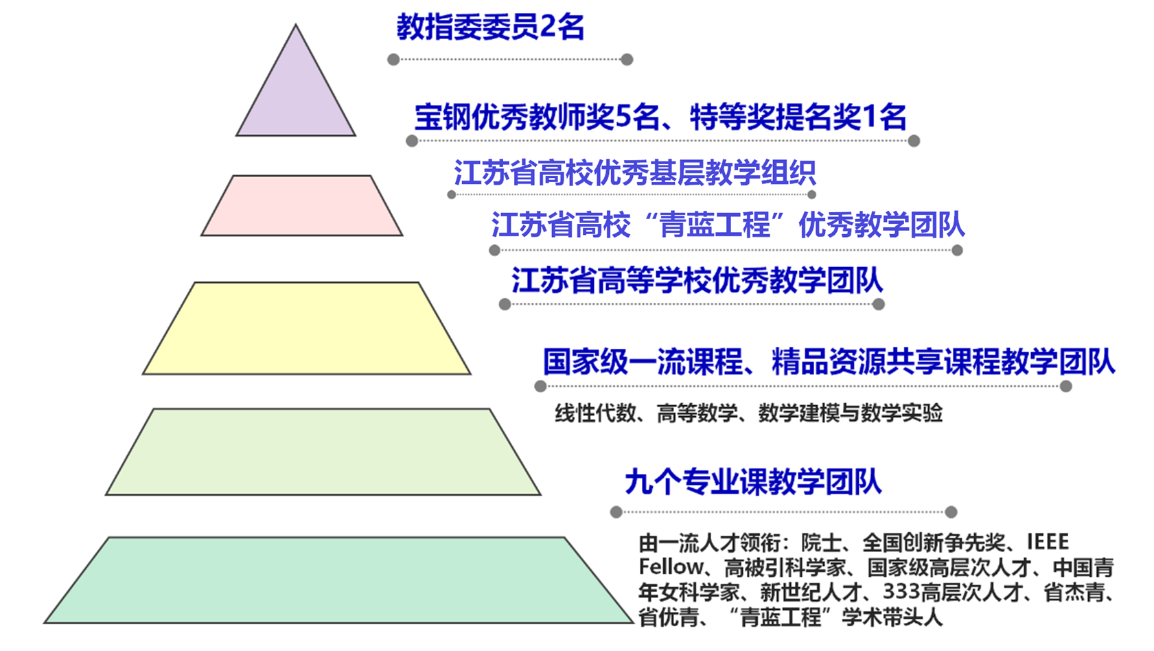 全院共有教职工117人,其中教授32人(校首席教授2人、青年首席教授2人和青年特聘教授1人),副教授53人,讲师22人;博导41人、硕导71人。教师队伍中有俄罗斯科学院院士1人、欧洲科学院院士1人、IEEE Fellow 1人、国家级高层次人才2人、国家级高层次青年人才7人次、科睿唯安(Clarivate Analytics)全球高被引科学家5人、教育部新世纪优秀人才3人、教育部教指委委员2人、宝钢奖获得者5人、江苏省教学名师1人、江苏省“青蓝工程”科研创新团队、江苏省高校优秀基层教学组织、江苏省“青蓝工程”优秀教学团队、江苏省高等学校优秀教学团队,设有江苏省统计科研基地和江苏省企业研究生工作站。近五年引进毕业于 北京大学、哈佛大学等一流大学的教授和博士共计20余名,已形成一支国际知名学者领衔、梯队结构合理、基础与应用并重、交叉特色明显的教学队伍。