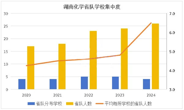 湖南省化学竞赛代表队的成员分布呈现高度集中态势,通常仅来自4所主要学校,仅有两年扩展至5所,这一现象凸显了少数强校在化学竞赛领域的显著主导地位。值得注意的是,至2024年,这一集中度达到近五年来的最高点,平均每所学校贡献的省队成员数量约为6.5人,进一步印证了这些学校的强势地位和卓越的化学教育实力。