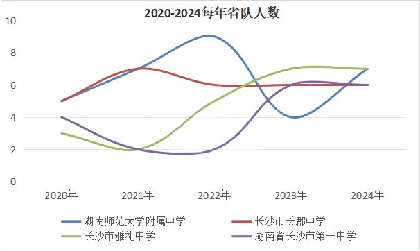 从省队总人数的角度看,四大名校彼此之间存在一定差距。湖南师范大学附属中学和长沙市长郡中学领先另外两所名校较多。湖南师范大学附属中学作为老牌竞赛强校,以其深厚的竞赛基础领跑全省。长沙市长郡中学实力稳扎稳打,未出现过省队人数大幅下降的情况。