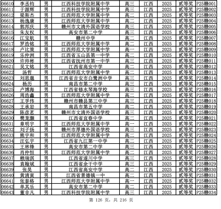 江西省2025年中学生物理竞赛复赛省二获奖名单