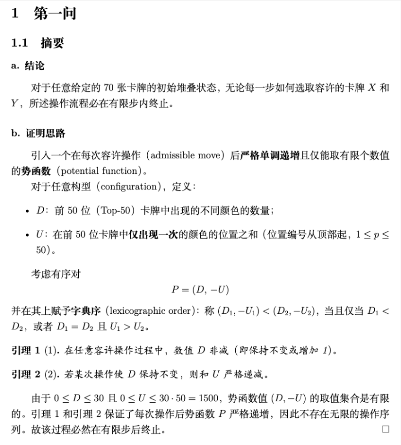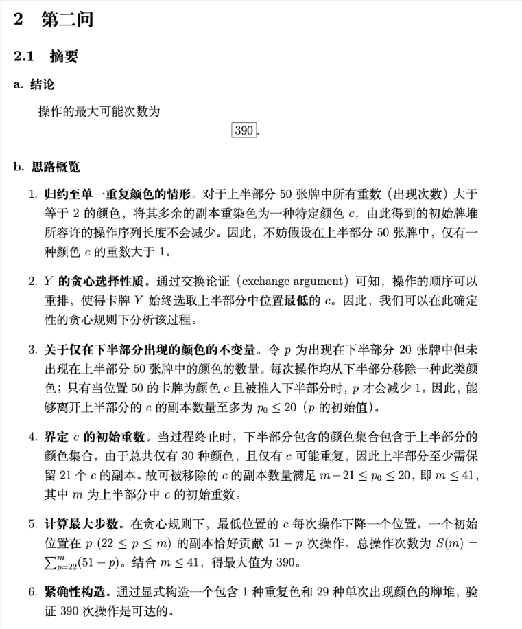 以第四题为例:有30种颜色的纸牌,每种颜色的纸牌均有70张。开始时从这些纸牌中任意选取70张,并从上至下摆成一叠。接着进行如下操作:从最下方20张纸牌中选择一张纸牌 X,满足其颜色在最上方50张纸牌中从未出现;再从最上方50张纸牌中选择一张纸牌Y,满足其颜色在最上方50张纸牌中至少出现两次;从这叠纸牌中抽出X并将其紧贴着Y的上方放回这叠纸牌中。称上述过程为一次操作。重复上述操作直至无法选取这样的纸牌X时,整个操作过程结束。