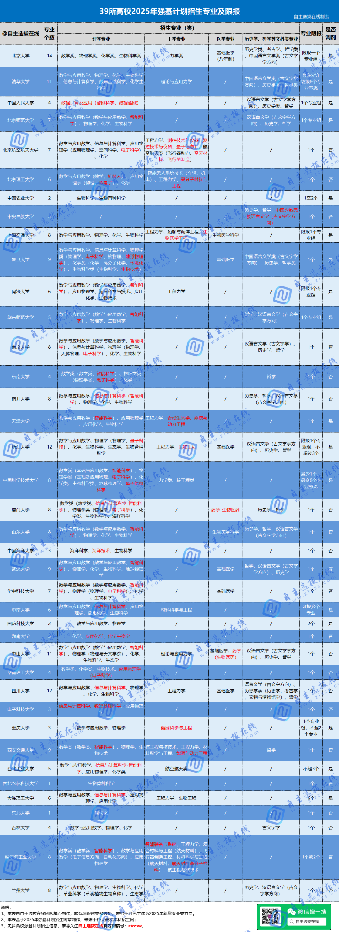 1、上表内容来源于2025年强基计划招生简章,表中标红专业为2025年新增招生专业,2026年具体情况以当年实际发布的简章为准;