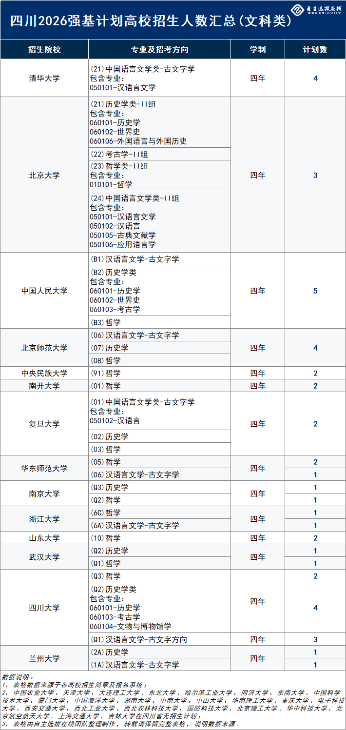 四川省2026年强基计划招生计划数(历史类)已经出炉,那么,具体各个学校分别投放多少招生计划呢?接下来为大家带来相关招生计划盘点,供大家进行参考!