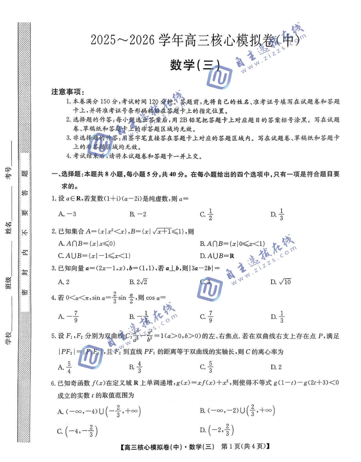 九师联盟2026届高三核心模拟卷(中)三数学试题及答案