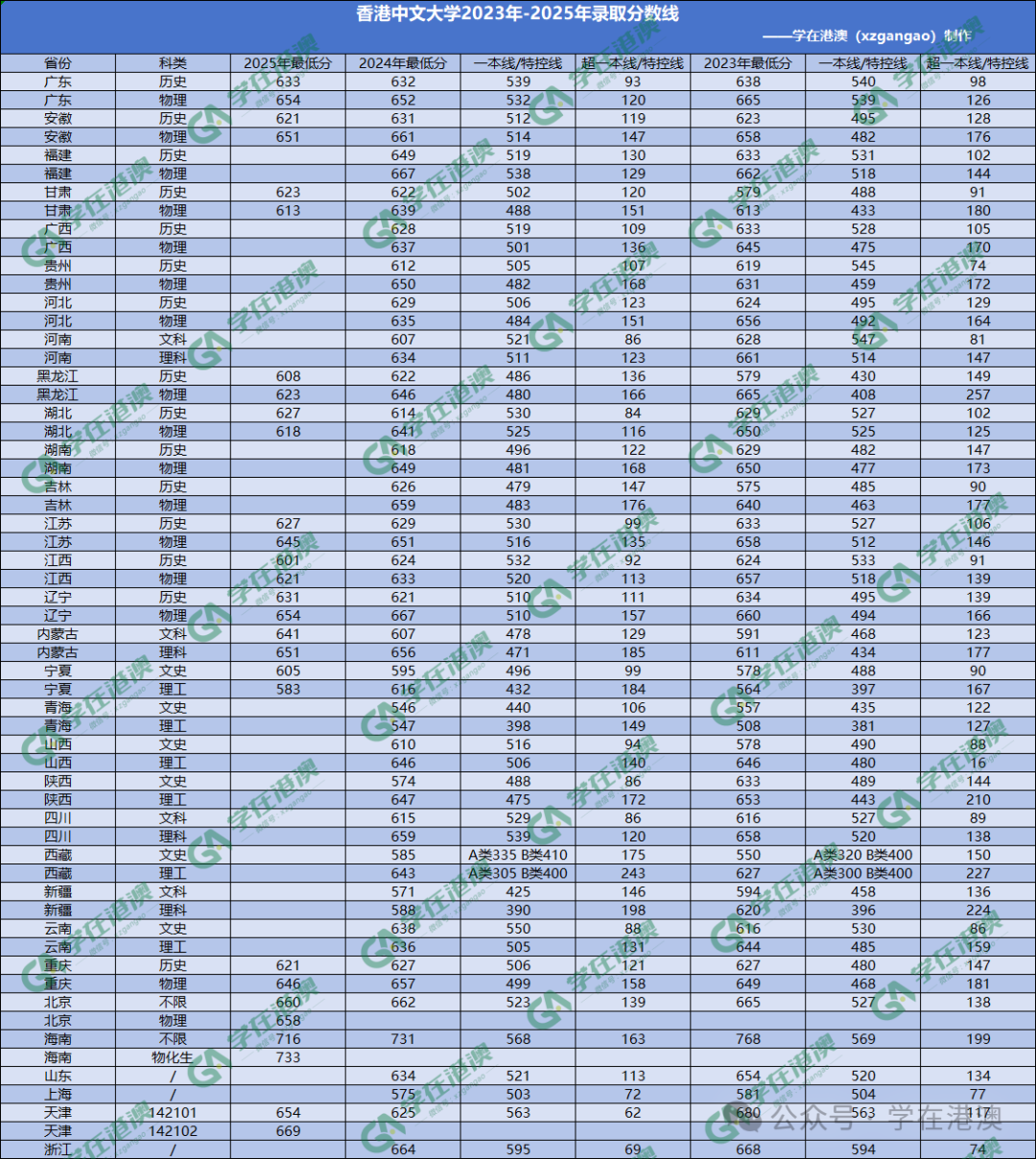 下表为香港中文大学在2023年-2025年面向各省市的录取分数线: