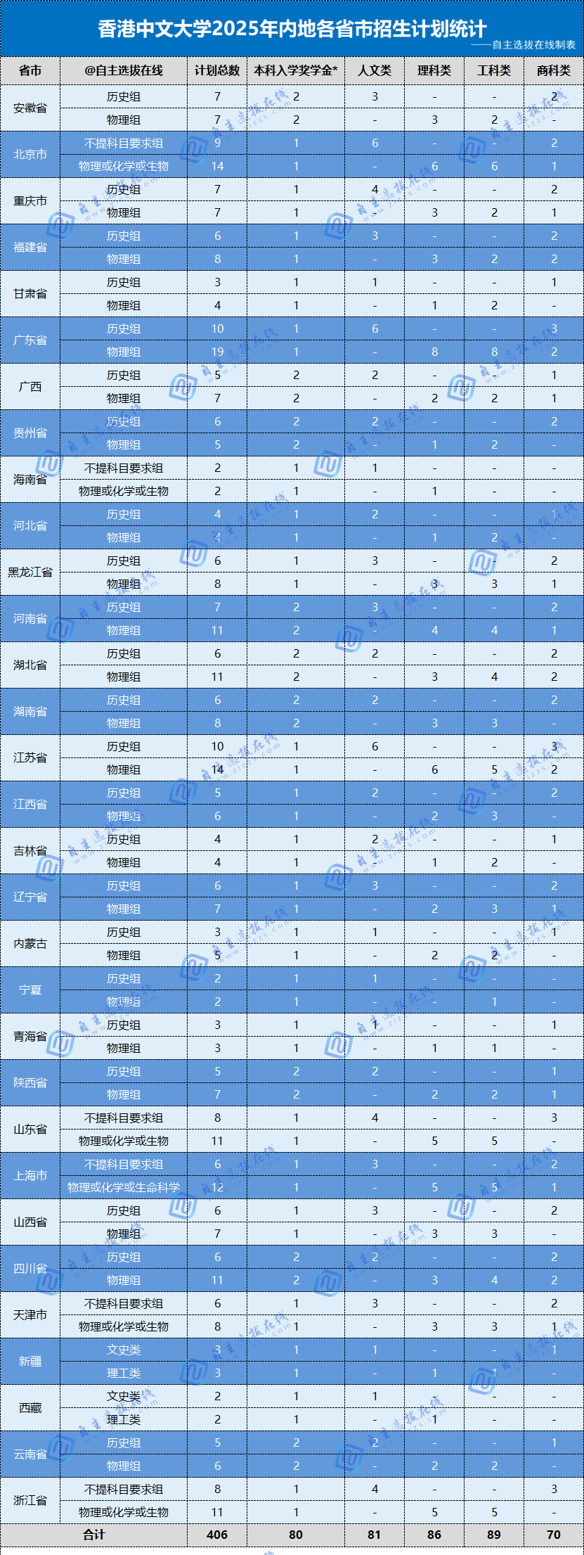 香港中文大学2025年面向全国31个省市进行招生共406人。目前,2026年的港校申请正在火热报名中。香港中文大学作为唯二在内地进行统招的学校向来备受关注,为了让大家更好地了解香港中文大学的招生计划及往年录取数据,今天学在港澳特别整理了相关信息,有意的学生家长重点关注。